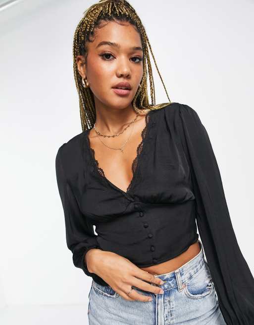 Stradivarius satin button detail romantic blouse in black ASOS
