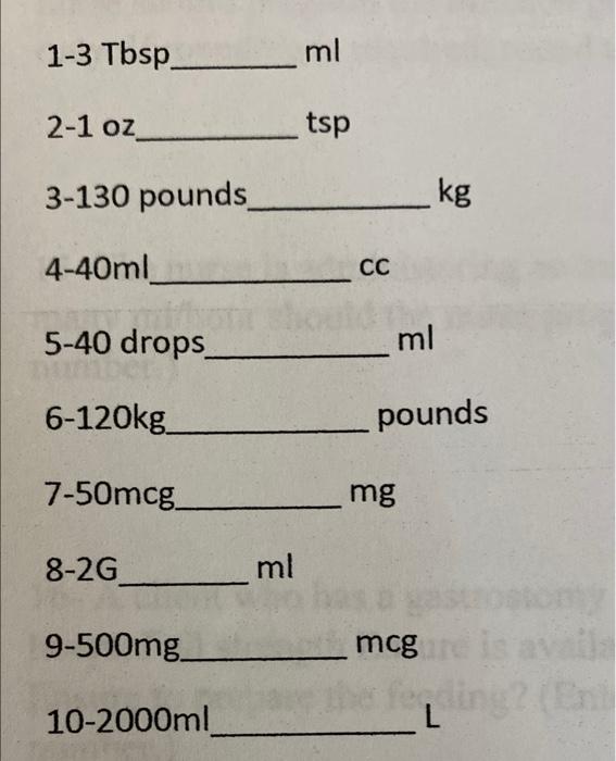 Solved 1 3 Tbsp ml 2 1 oz tsp 3 130 pounds kg 4 40ml CC 5 40