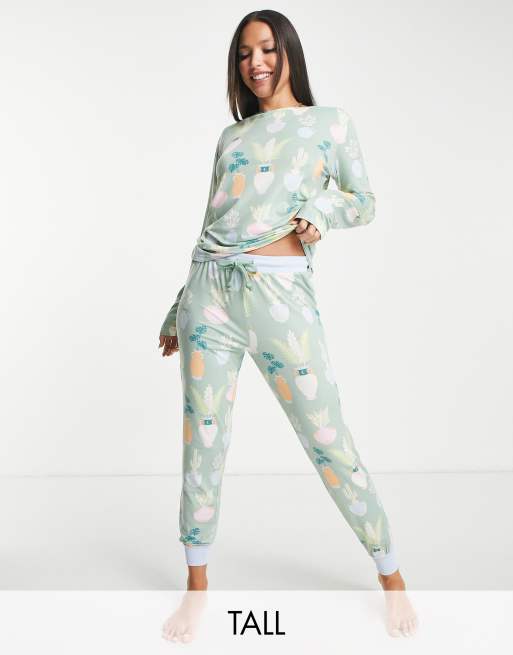 Chelsea Peers Tall jersey long sleeve top and jogger pajama set in sage plant print
