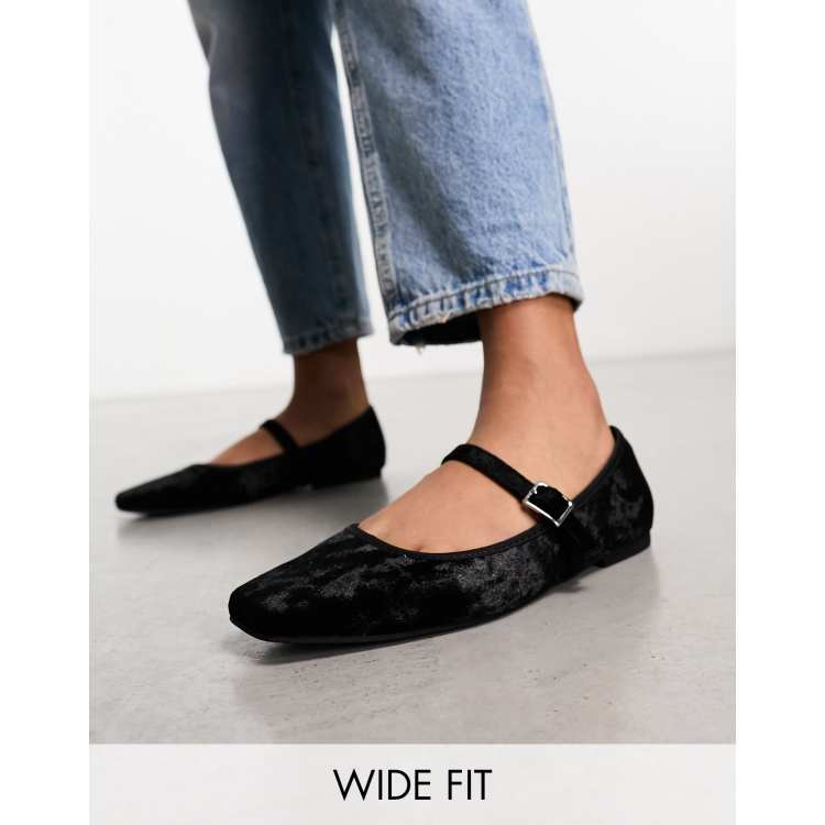 ASOS DESIGN Wide Fit League velvet Mary jane ballet flats in black
