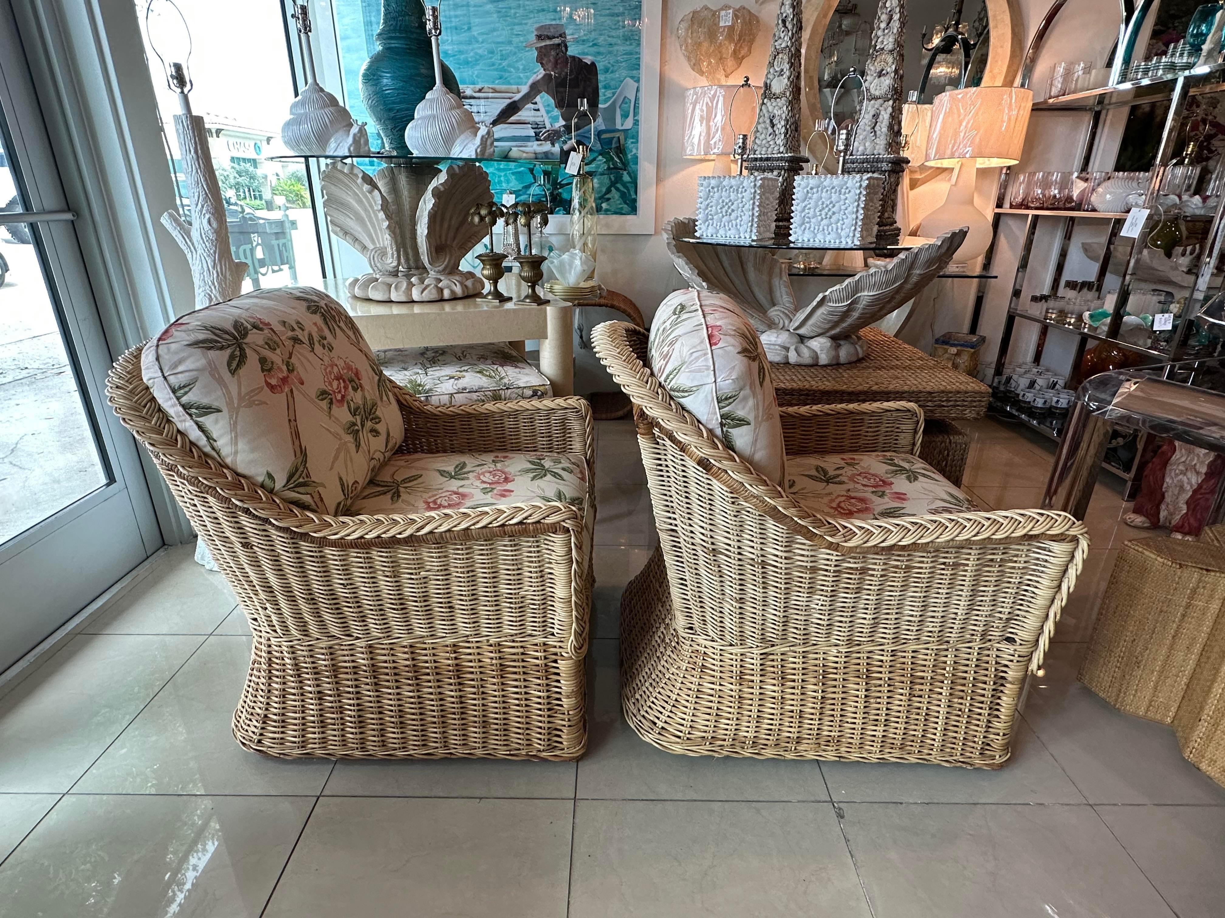 3 Pc. Set Rattan Braided Wicker Works Club Lounge Pair Arm Chairs Ottoman
