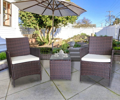 Dark Brown Rattan Cream Cushions 3 Piece Garden Bistro Set Chairs