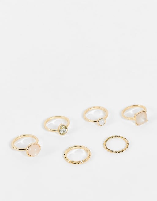 ASOS DESIGN pack of 6 rings with pastel coloured stones in gold tone