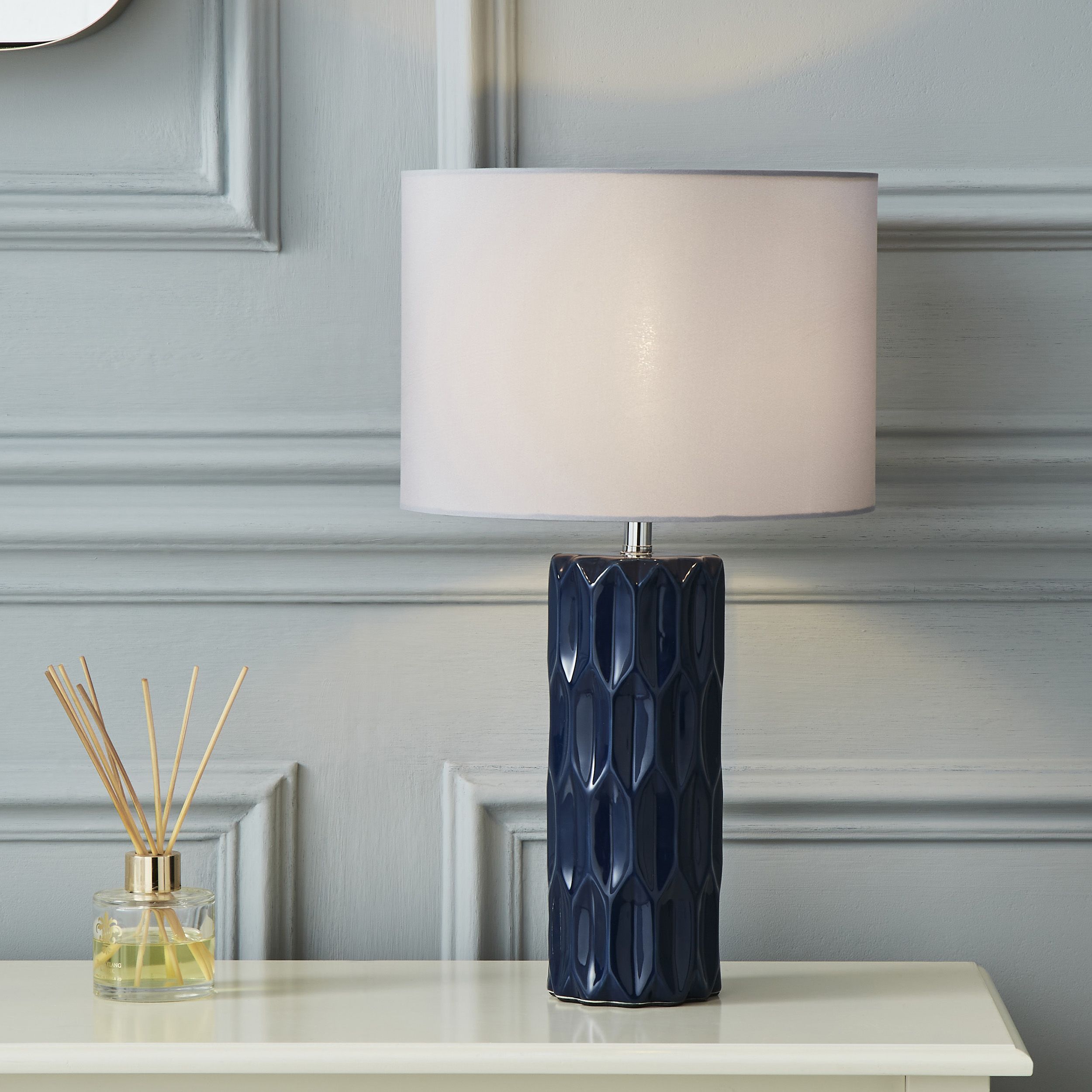 Navy side hot sale lamp, The Lighting Edit Maja Geometric Navy Cylinder Table lamp hot sale