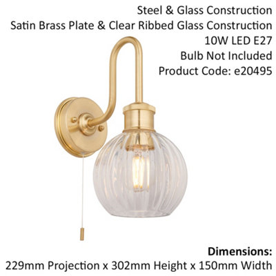 Satin Brass Bathroom Wall Light Ribbed Glass Shade IP44 Rated