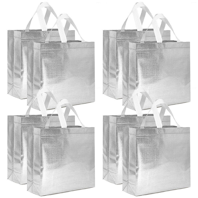 12 Pack Silver Gift Bags Medium Size Reusable Gift Bags with Handles Shine Glossy Gift Bags Metallic Non Woven Gift Bags for Wedding Christmas