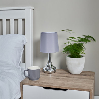 ValueLights Pair Of Modern Silver Chrome Teardrop Touch Bed Side Table Lamps With Grey Fabric Shades